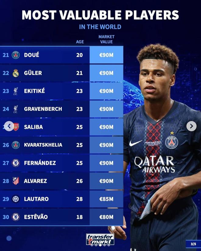 21. 杜埃(巴黎圣日耳曼)9000万欧元