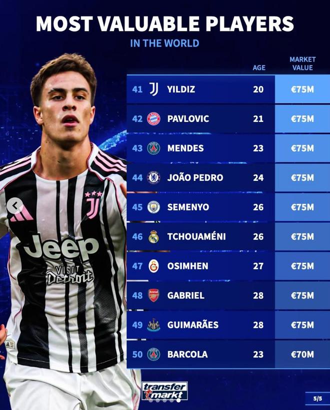 41. 凯南-伊尔迪兹(尤文图斯)7500万欧元