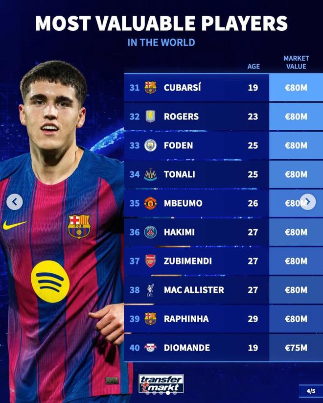 北京时间3月29日,在更新了欧洲五大联赛球员的身价之后,德转列出了目前身价足坛身价排名前50的球员,亚马尔、哈兰德、姆巴佩2亿欧元领衔,共有20名球员身价过亿。