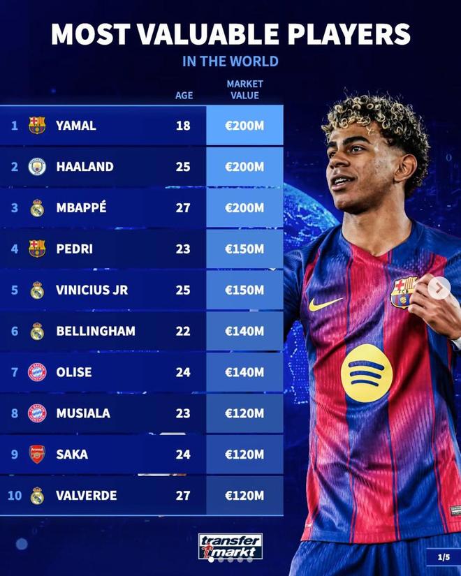 1. 亚马尔(巴塞罗那)2亿欧元